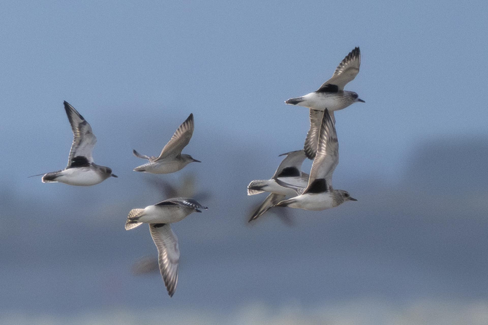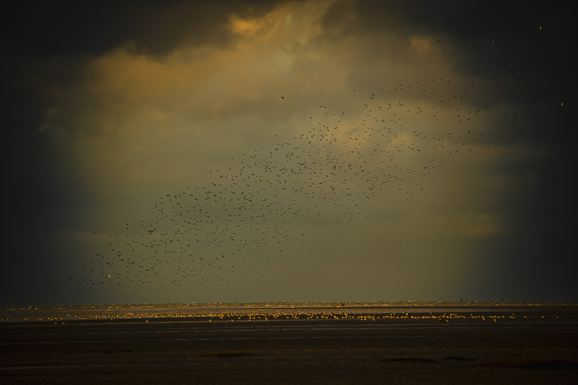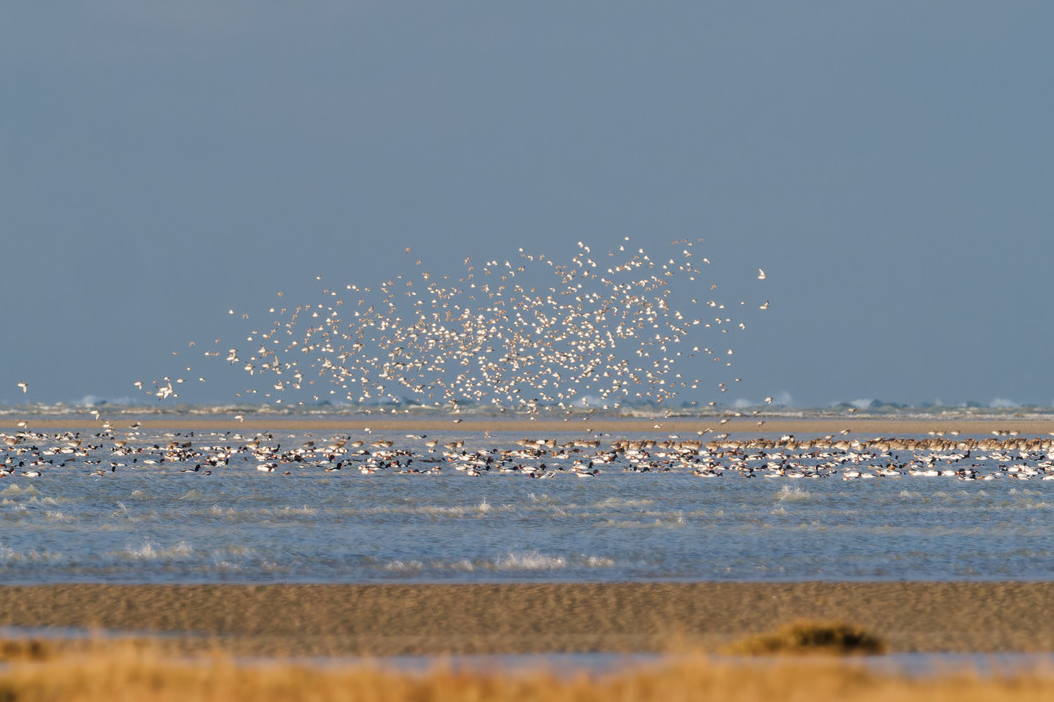 La marée monte lentement, inexorable. Puis soudain, le spectacle commence. Les premiers nuages de limicoles surgissent, mouvants, vivants, presque irréels. Un ballet hypnotique, un murmure d’ailes, une fresque animée un peu trop lointaine pour les capteurs… frustration douce-amère du photographe, vite balayée par l’émotion brute de l’instant.