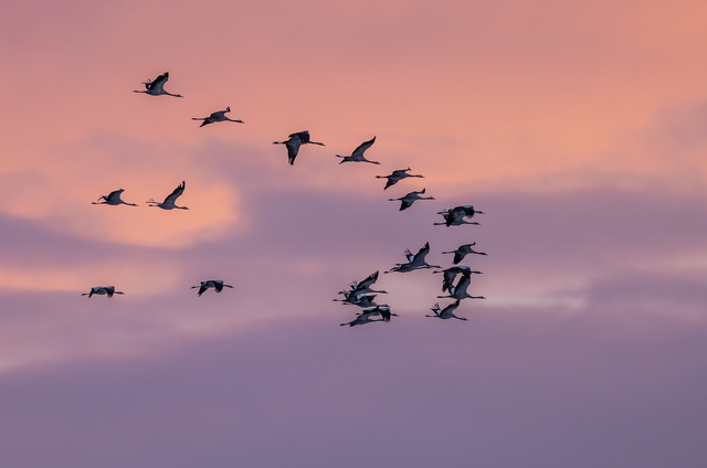 L’un des moments clés de notre escapade a été l’observation des grues cendrées en migration. Chaque année les grues migrent depuis la Scandinavie vers le sud de l’Europe. 200 à 350 milles transitent dans cette zone et 20 à 30 milles y restent l’hiver. Durant leur séjour elles partent tôt chaque matin de leurs lieux de repos nocturnes pour aller se restaurer dans les environs et y reviennent en fin de journée. Pour observer leur ballet majestueux et sonore il faut donc se lever dès potron-minet et revenir au coucher du soleil. C’est un spectacle magnifique et impressionnant dont nous avons pu fixer quelques souvenirs.